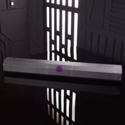 - Drücke auf den Knopf am Griff, um die abnehmbare Laserschwertklinge in Lila erleuchten zu lassen